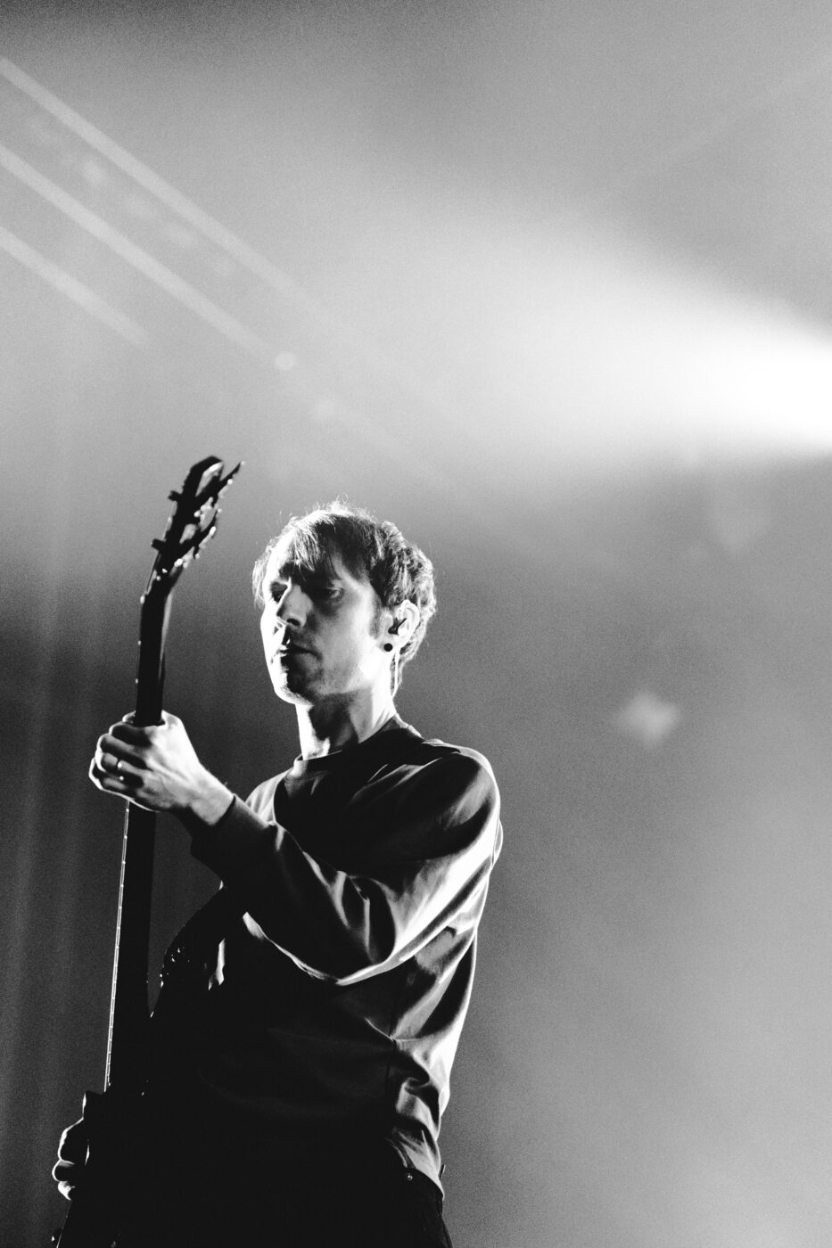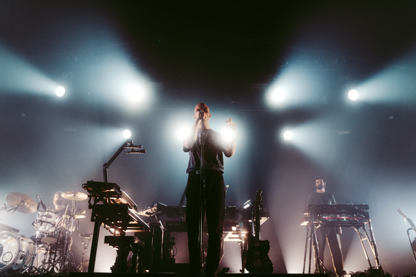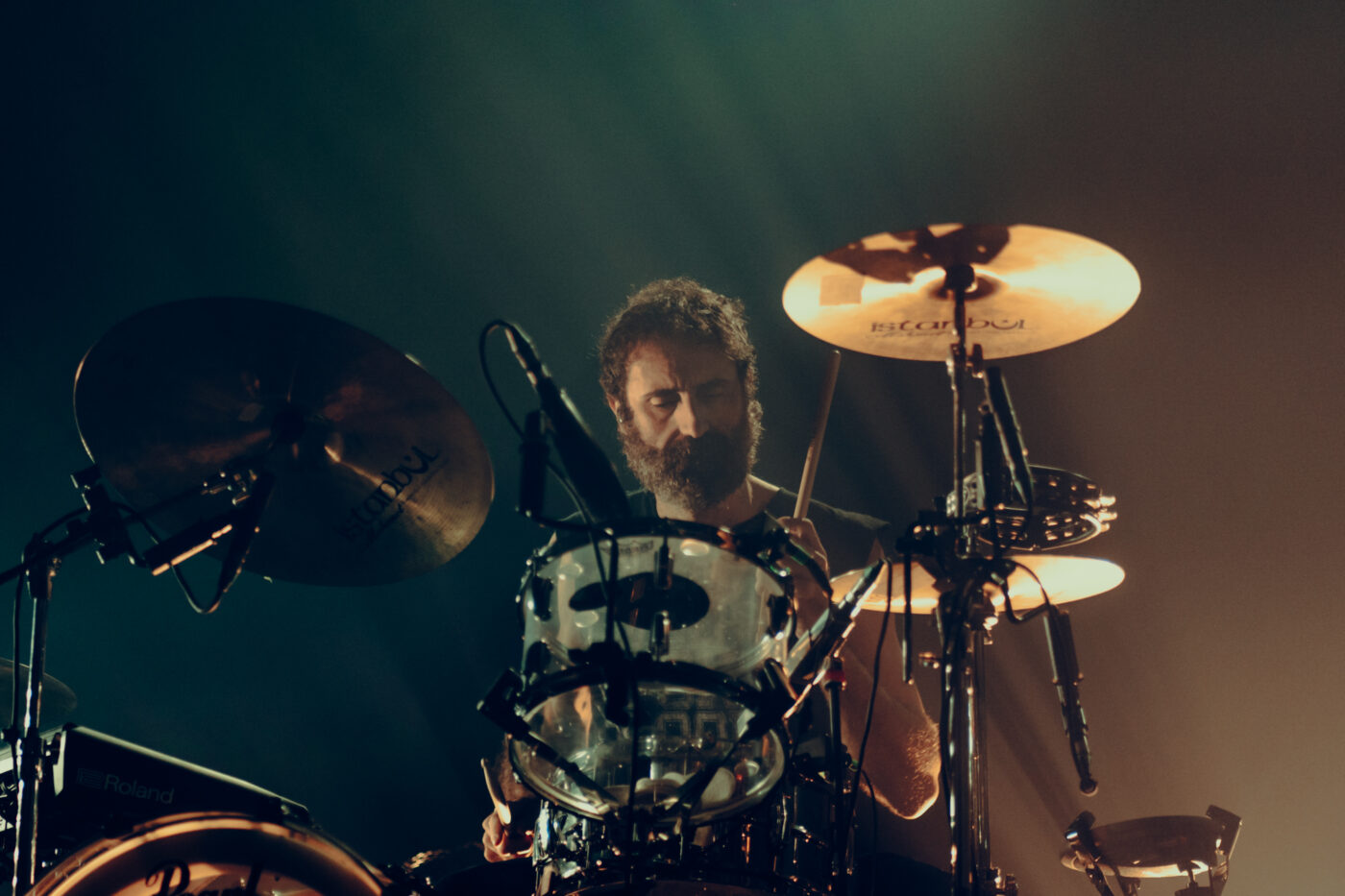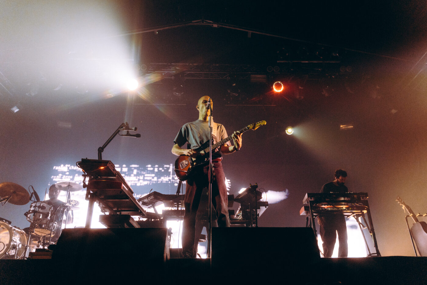 I sei componenti della band prendono posto sul palco e veniamo ipnotizzati da questa scenografia incorniciata da un cerchio di luci che ricorda un po’ il varco di luce o la navicella spaziale che ci porta avanti e indietro fra gli album della loro discografia. Sono in compagnia di alcuni fedelissimi, paladini dei primi lavori: Il sorprendente album d’esordio de I Cani, Glamour fino al penultimo (ormai datato) Aurora. Io, voce fuori dal coro, sono lì, sì anche per qualche storico vecchio brano, ma principalmente per sentire dal vivo Post Mortem, ultimo album uscito a sorpresa lo scorso aprile, che con 2-3 tracce ben assestate in pancia, mi ha stregato.