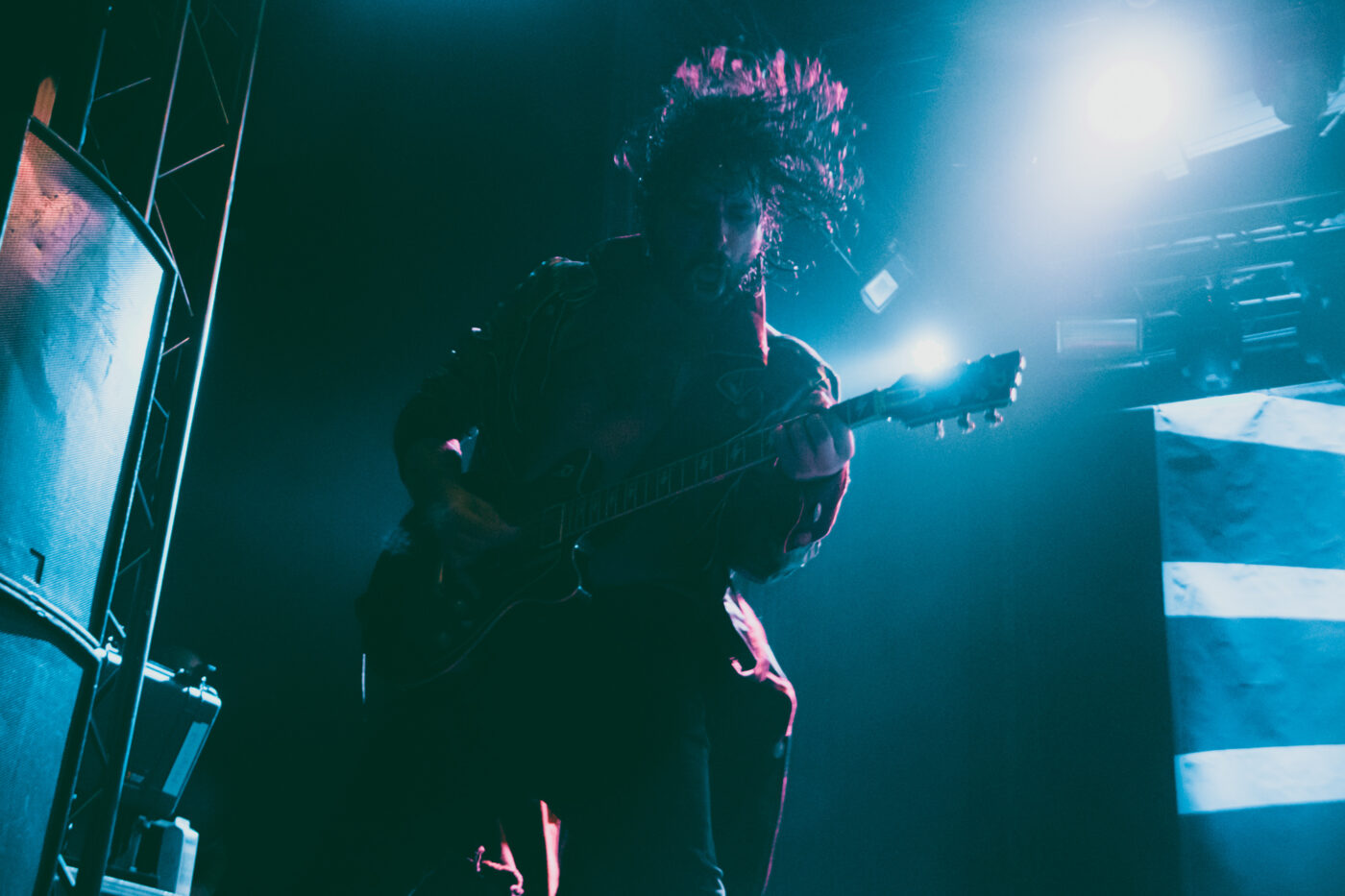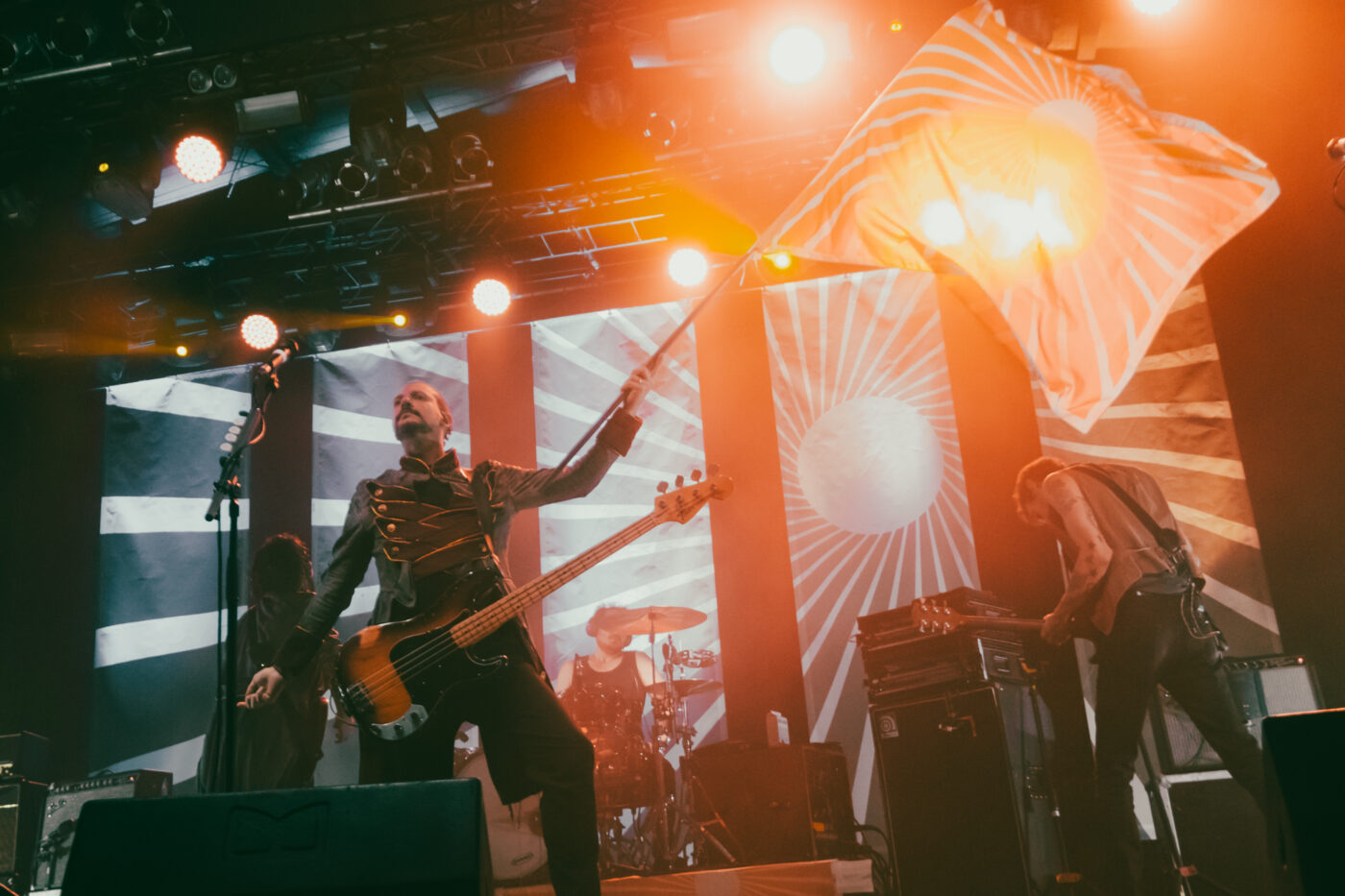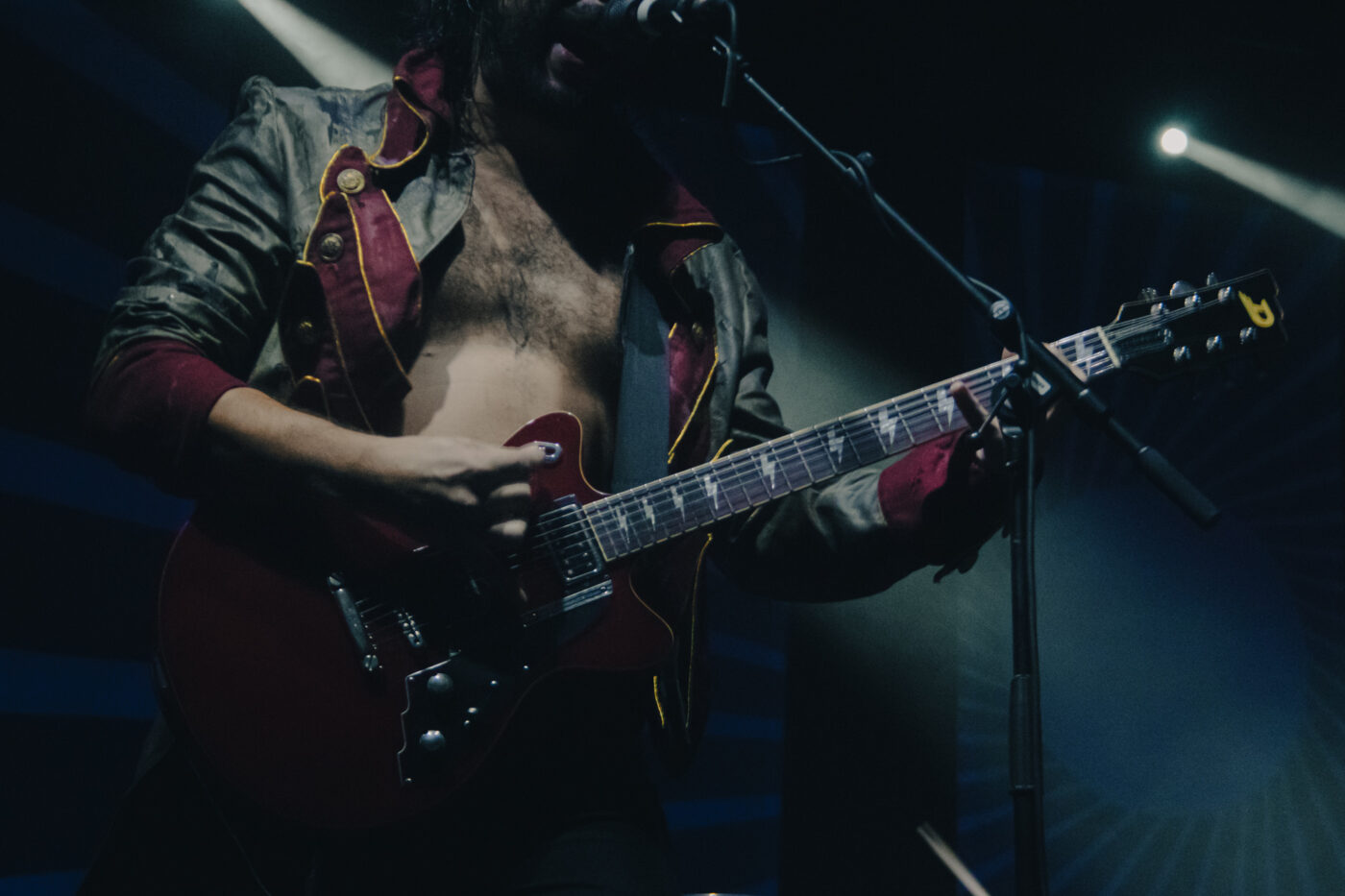 Sono sembrati tutti in forma come al solito, a sudare sotto le nuove giacche napoleoniche immaginate e realizzate dallo stylist Nicolò “Nick” Cerioni; tranne Michelino che si presenta in canottiera, comodo per assestare le sue pacche sul rullante. Fede partecipa alla performance con il corpo, con le espressioni del volto, con tutto sé stesso (compreso tutto il suo sudore) e quando mi regala l’assolo di Palude, sono davvero una persona felice. Divi rimane una delle migliori voci del rock italiano attuale: incisiva, vigorosa, in qualche modo ruvida e limpida allo stesso tempo. Non smette di concedersi – giustamente – le sue buone abitudini da rockstar: indìce i poghi, raggiunge il pubblico e si siede (fino a stendersi) tra di noi, cantando una versione acustica di Vestirsi Male, sventola la bandiera con il sol levante di Aurora Popolale e surfa sulla folla. In un’intervista recente ho sentito Michele Esposito definire il più grande pregio di Divi essere “una persona di grande cuore” e ce ne accorgiamo dalla generosità con cui parla degli altri, dagli interventi rivolti al pubblico, al fervente orgoglio con cui presenta i suoi compagni di band, fino alla chiusa in cui spende più di una buona parola nei confronti, non solo della squadra tecnici del tour, ma anche dei Circus Punk in apertura, commentando quanto sia importante per lui fare luce sulle nuove leve, sui tanti promettenti talenti della nuova generazione.