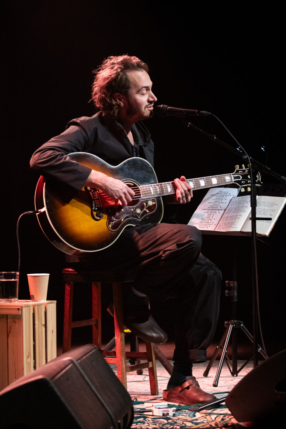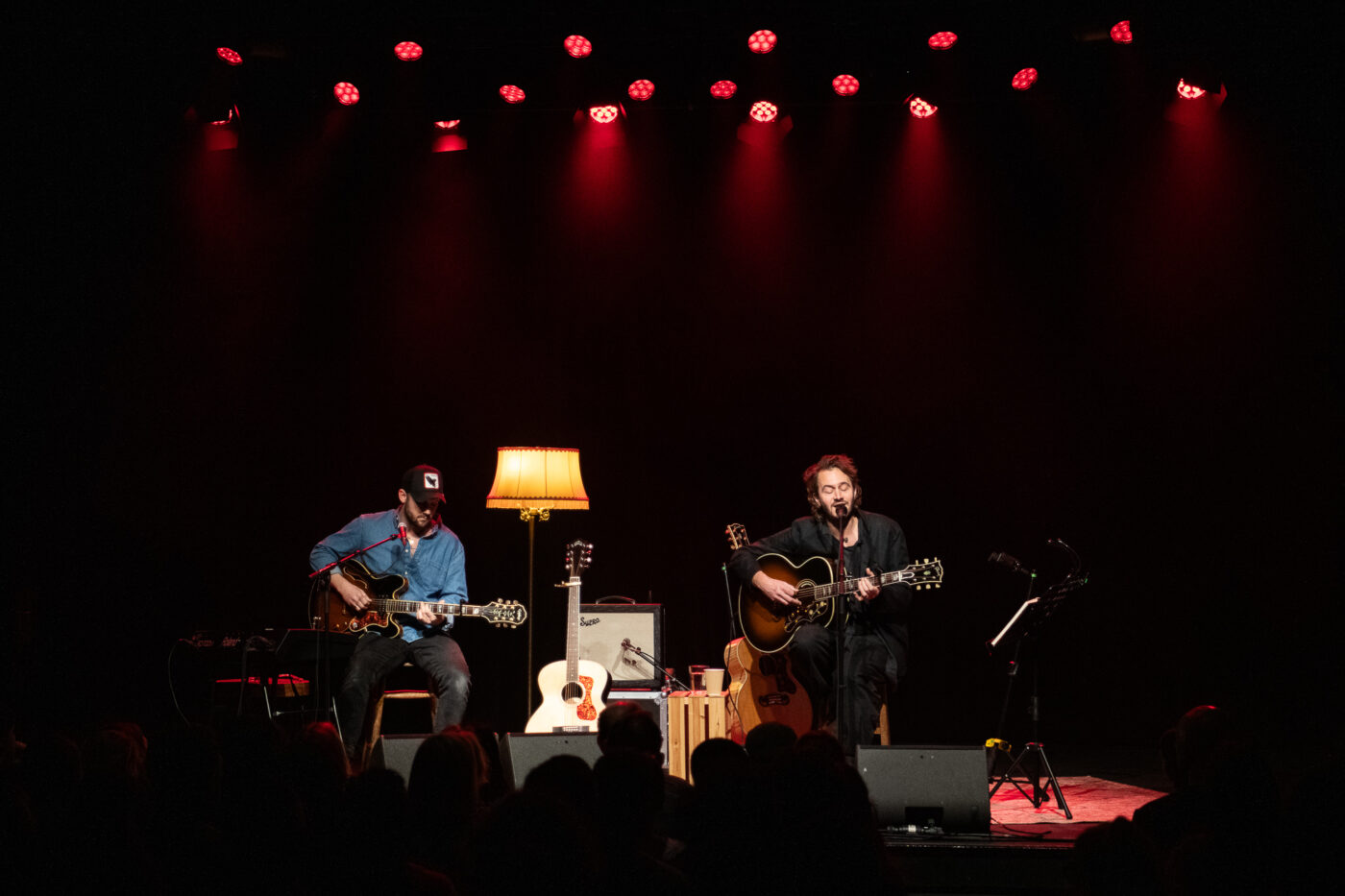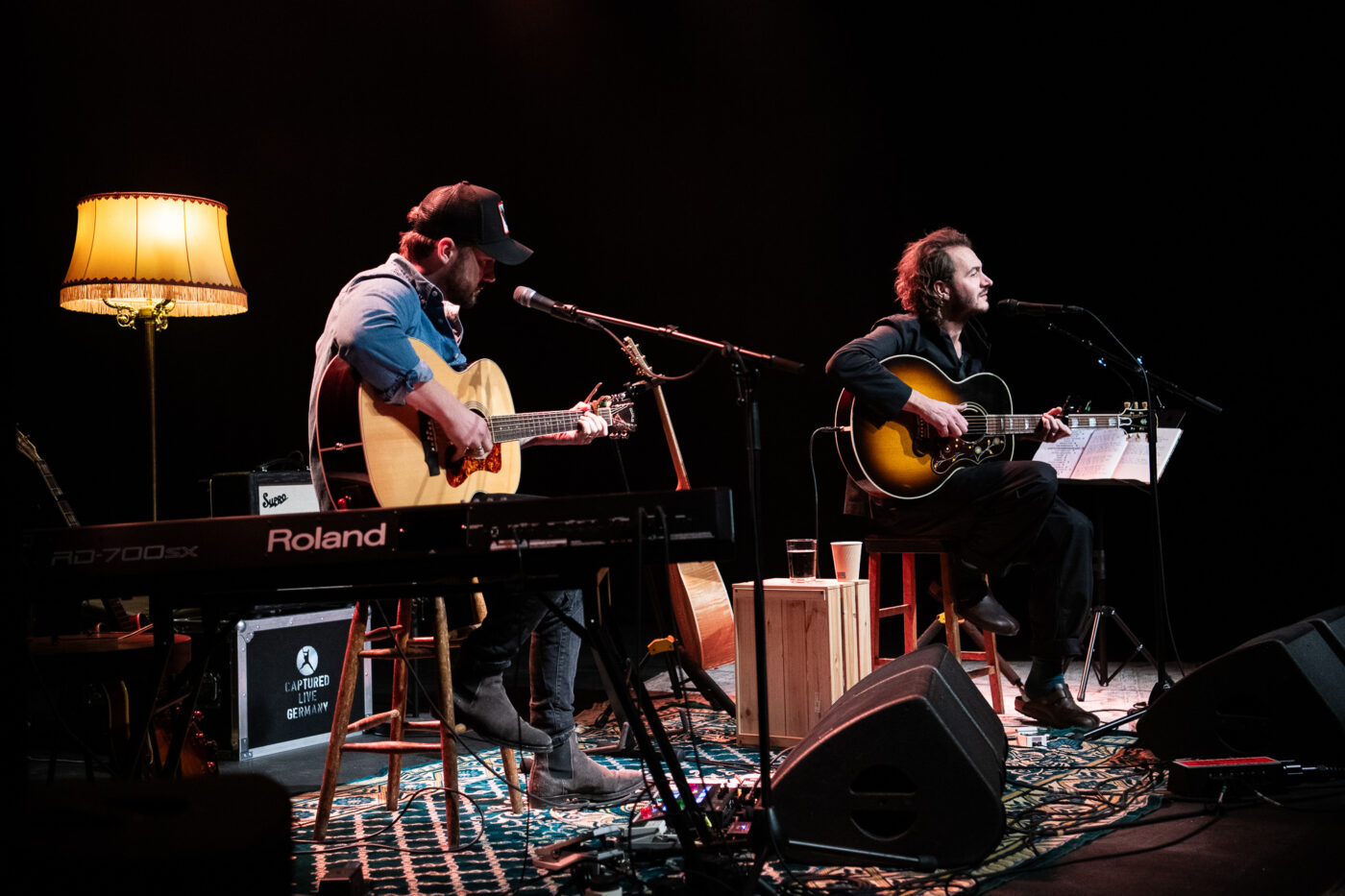 The stage is cozy: a thick carpet, a floor lamp that clearly belongs to the living room of that old aunt we all have, a wooden crate that doubles as side table and instruments for two, as Nicholas Willes, already touring member of Editors, helps Tom as second guitar and keyboard.