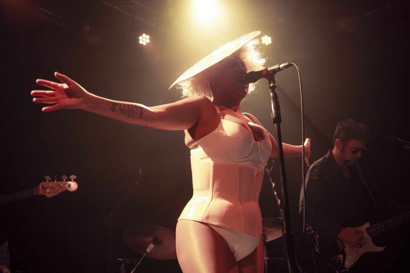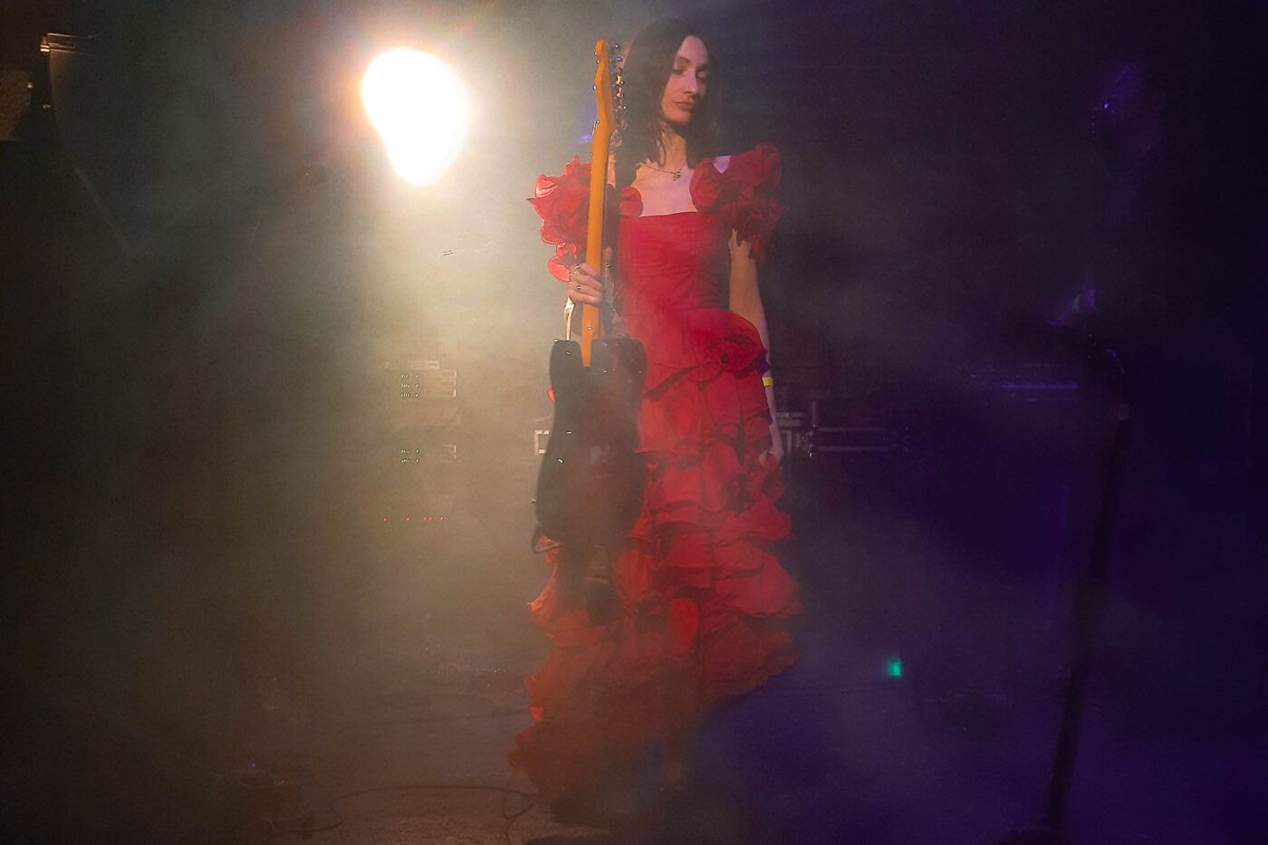 Alle ore 21:15 iniziano i King Hannah. Li avevo intercettati già dall’uscita dell’EP Tell Me Your Mind And I’ll Tell You pubblicato nel 2020, catturandomi per i flashback alternative rock. Così giovani, così sicuri, anche sul palco. Dopo l’entrata della intera band, Hannah Merrick arriva con un vestito a balze rosso da grande occasioni e ai piedi sneaker consumate. Voce sussurrata e gradatamente verso toni confidenziali, poi assertivi. Craig Whittle aggrappato alla sua chitarra autorale, poi blues, poi grunge e infine sonica. Affascinano i presenti, molti già accaniti fan, con brani, curati, intensi, maggiormente in quei momenti in cui anche Hannah si veste di chitarra e carica nel suono.