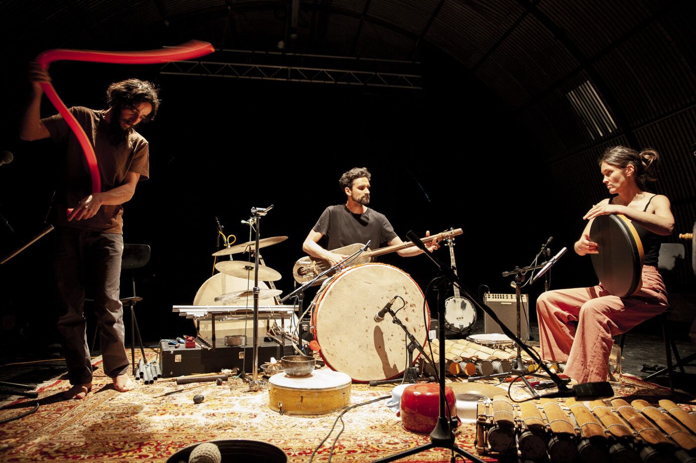 Ma facciamo un passo indietro. I Širom sono Ana Kravanja, Samo Kutin e Iztok Koren, suonano e giocano con un numero incredibile di strumenti, alcuni autocostruiti come vere e proprie opere d’arte do it yourself, altri provenienti della tradizione popolare slovena di cui riporto alcuni di seguito in ordine sparso: viola, violin, ribab, daf, ocarinas, balafon, mizmar, guembri, banjo e molti altri.